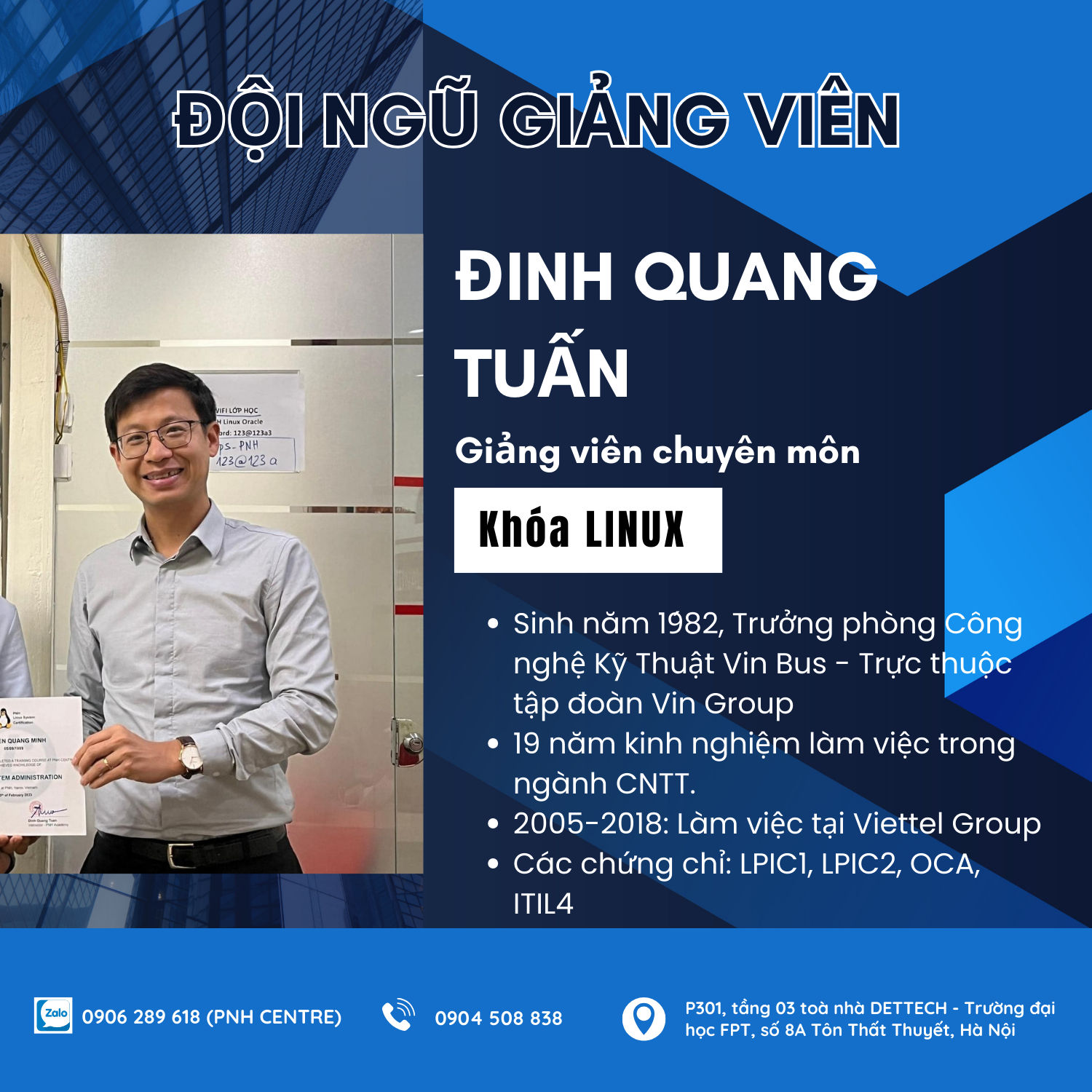 Phụ trách giảng dạy khóa học Quản trị hệ thống Linux tại PNH là thầy Đinh Quang Tuấn (sn 1982). Thầy Tuấn đã có trên 15 năm kinh nghiệm làm việc tại các tập đoàn lớn và công việc hiện tại của thầy là Trưởng phòng Kỹ thuật Công nghệ Vin Bus trực thuộc tập đoàn Vingroup.